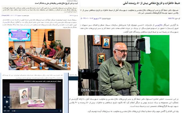 ◄ مسئول دفتر حفظ آثار و نشر ارزشهای دفاع مقدس و مقاومت شهرستان آمل از ضبط خاطرات و تاریخ شفاهی بیش از 50 رزمنده و 90 نفر از والدین شهید توسط کارگروههای تخصصی خبر داد.